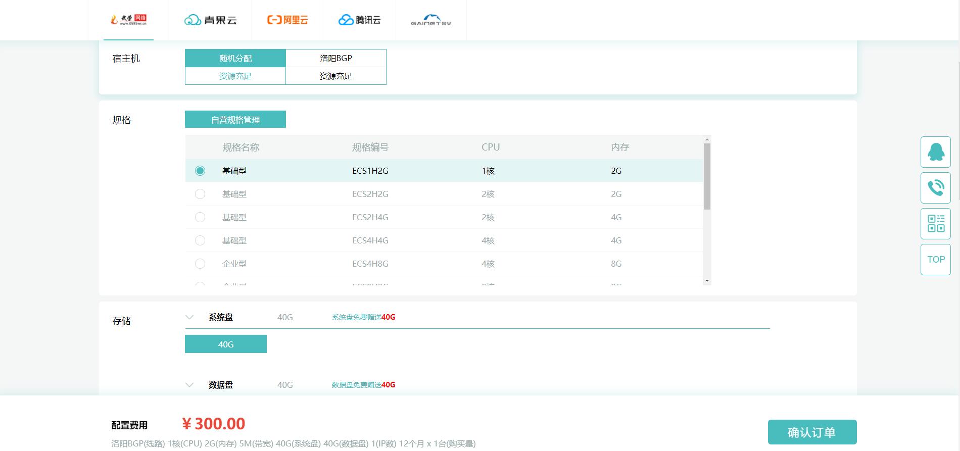 2G | 1核 | 40G | 5M | 300元/年 | 連接 |