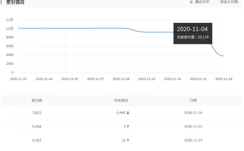 根據(jù)百度站長平臺(tái)提供的索引情況截圖來看,11月16日這天大量網(wǎng)站索引量出現(xiàn)斷崖式下跌的情況,可以說相當(dāng)慘烈,如下: